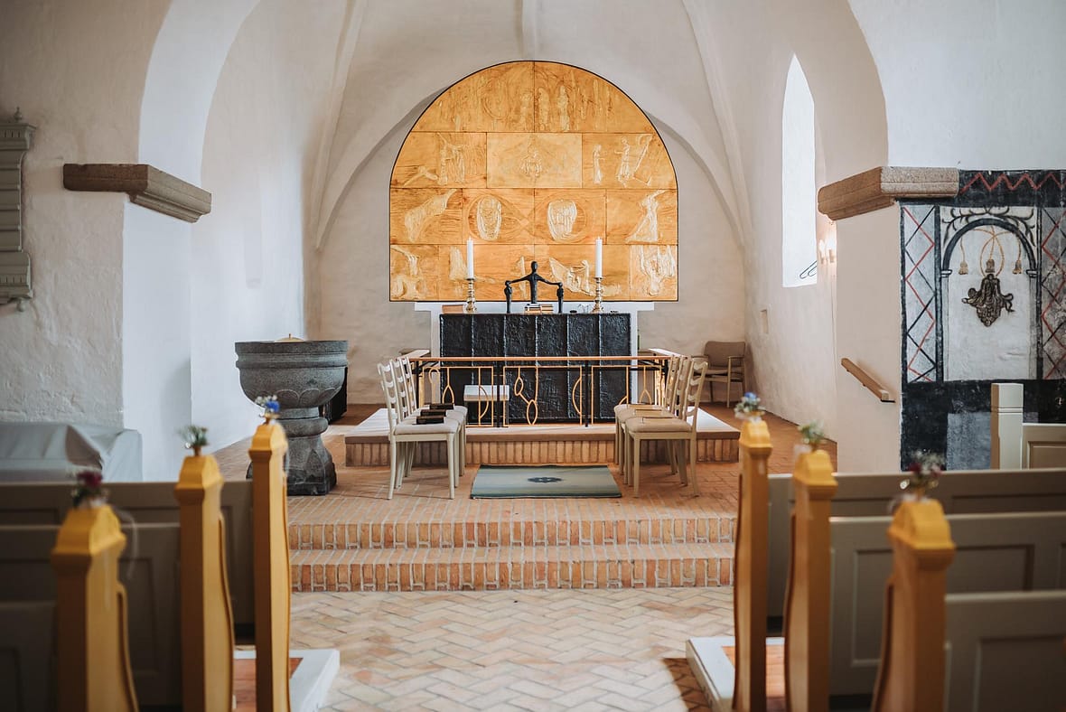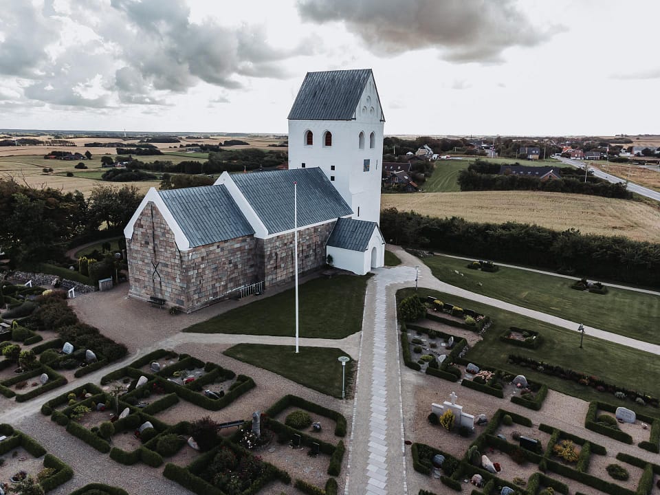 Fra pladsen ved kirken som ligger på en bakketop, kan man se langt ud over land og over Limfjorden et godt stykke mod Lemvig og Oddesund. Kirken er super smuk indvendig med et flot alter malet op i guldfarver. Og en tidligere elev fra efterskolen havde lavet den utroligt flotte og velsmagende kage