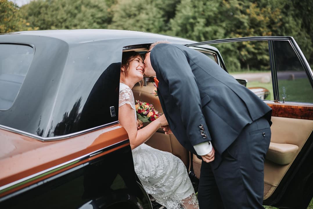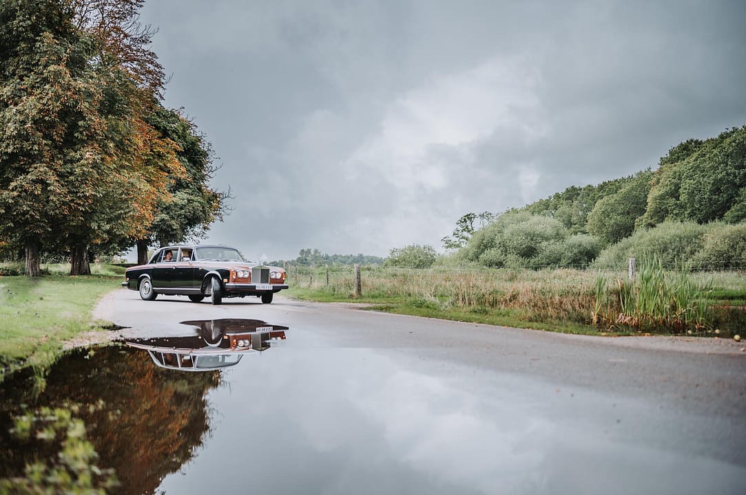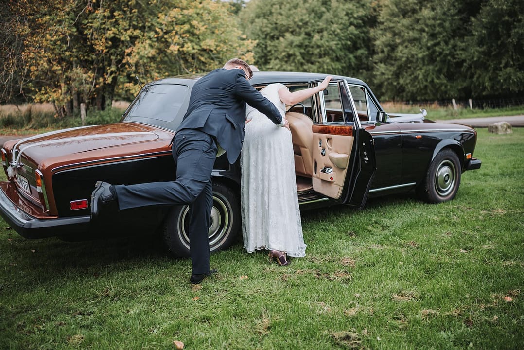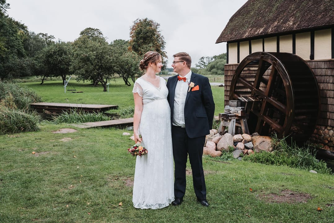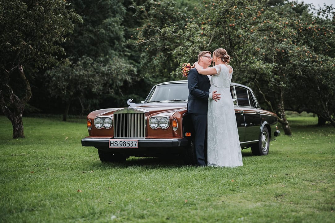 Da de ankom til fotosession ved Tvis mølle sø i en Smuk gammel Rolls Royce. Gik Sabina og HC direkte hen til den nye trækfærge og var helt klar til at tage billeder. De trodsede vejret skønt det regnede lidt og var lidt koldt, så var det ikke noget man kunne mærke på dem. Intet kunne kaste en skygge over dem på deres bryllupsdag.